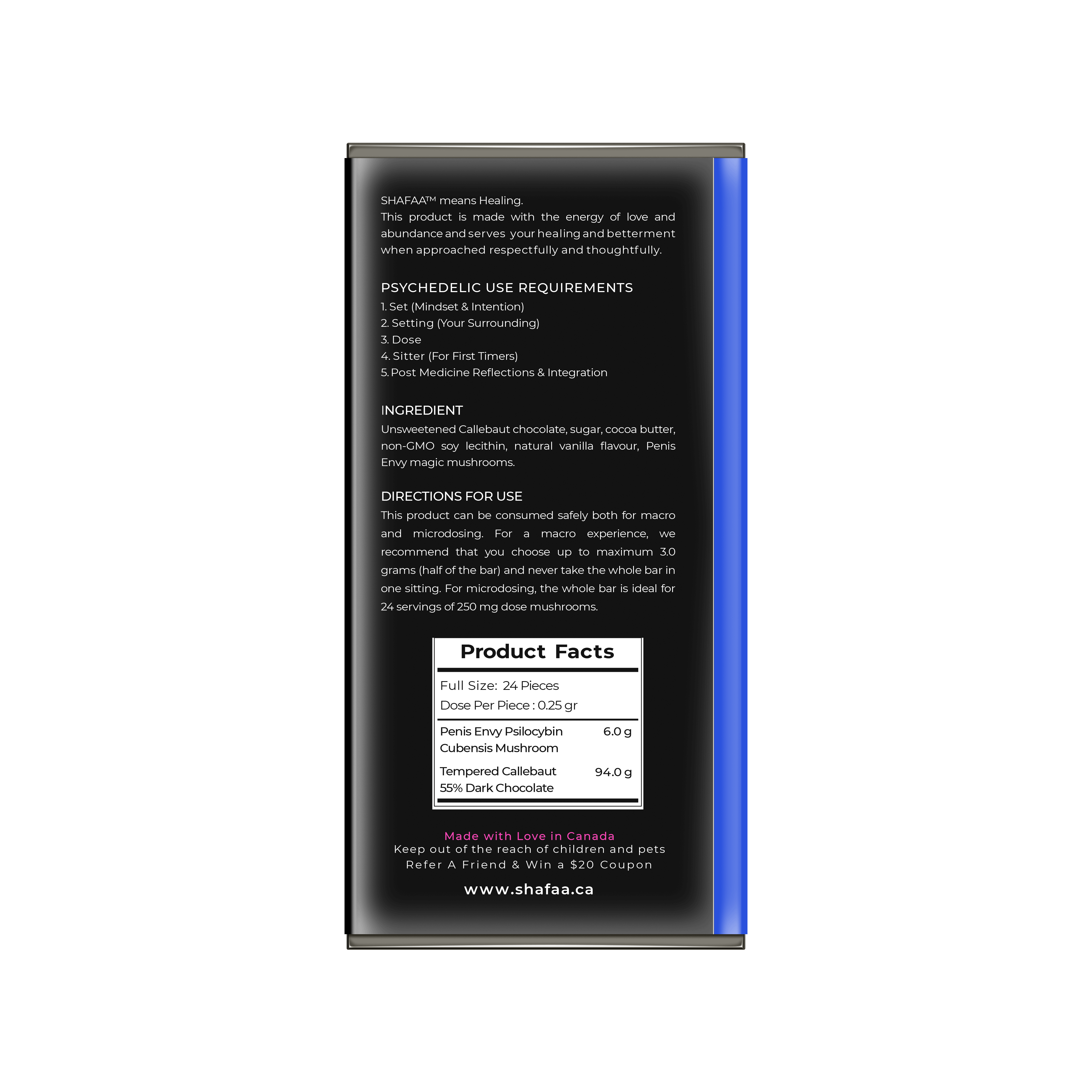 The bar consists of 24 breakable pieces with 0.25 grams of Penis Envy magic Mushrooms per piece, making it easy for both macrodosing and microdosing regimens.